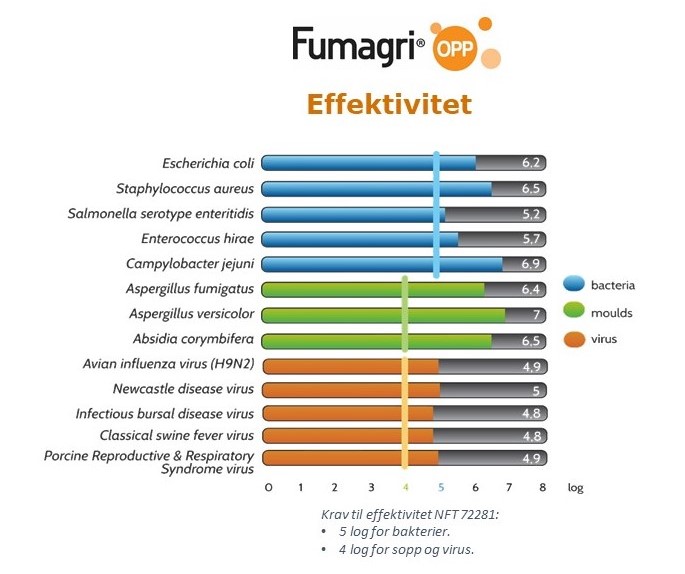 Fumagri OPP er en effektiv, tørr og meget lettbrukt desinfisering som er perfekt for å desinfisere kyllinghus, svinefjøs, inkubatorer og siloer. Desinfeksjonsmiddelet dreper blant annet Salmonella, Listeria og E.coli, samt mugg og sopp og en rekke andre virus. For å få best mulig effekt må lokalet vaskes grundig før Fumagri Opp benyttes. Vi anbefaler også en desinfeksjon med et bredspekter desinfeksjonsmiddel før røykdesinfiseringen.