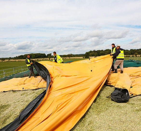 Ikke strekk plastikken stram over siloen, gi den plass til å forme seg etter overflaten og dermed minimerer luftlommer mellom plasten og fôret. For jevnt press, bruk rikelig med Silostop grussekker fordelt over siloen (se anbefalinger).